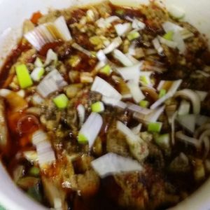 倒入菜籽油,炒菜的三倍量,稍微有点热度就下一把花椒,爆一会放姜、葱花,然后放一勺郫县豆瓣酱(我放了2勺,有点咸),翻炒爆香,然后放水,水量根据肉的多少和碗的大小,自己掌握。