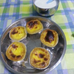 等蛋挞液放凉以后把两个蛋黄打散放进凉蛋挞液里面搅匀,倒入蛋挞皮里可以倒9分满哦!