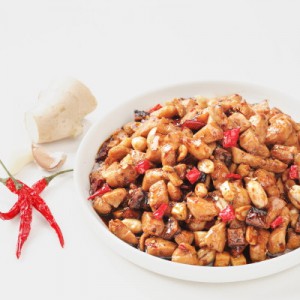 将250g鸡肉用刀背拍松,切成丁,加入15g黄酒,加入15g干淀粉,混合均匀,如需鸡丁口感更为滑嫩,可加入一个鸡蛋清。