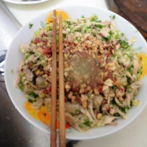 油炸的花生米压碎,也拌入鸡丝里