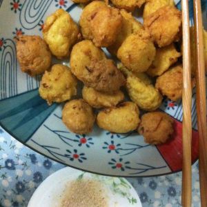 配上蘸料就可以开吃了。外酥里嫩又多了一点点海虾的味道。先生说:够五星级饭店饭菜的味道