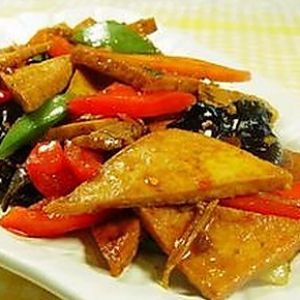 加入煎好的豆腐翻炒,加一勺十三香,滴入适量生抽,加一勺半食盐,翻炒均匀,关火出锅装盘,即可食用