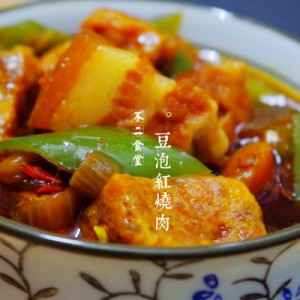 锅中放少油,姜蒜,豆瓣爆香,入五花肉块,翻炒,逼出些许肉油