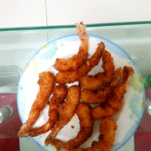 浸泡完以后把虾分别浸入面粉、鸡蛋、面包糠里裹一圈