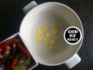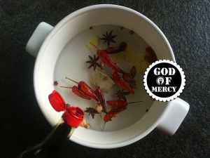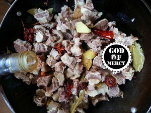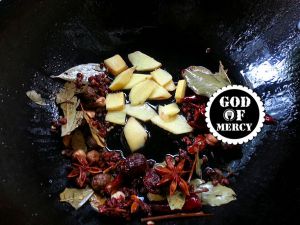 热锅凉油。放进生姜、干辣椒、八角、花椒、香叶、草果等爆香。