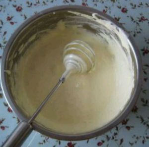1. 把白糖和蛋黄放在一起,用打蛋器打发,打成乳白色就可以了,就是这个样子的。当然没有打蛋器也可以用筷子,不过会很累。