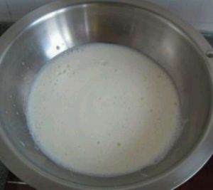 4. 将搅拌好的蛋奶液再倒回锅中,煮至微沸,关火,倒入容器中晾凉