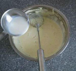 3. 将煮好的牛奶,用勺子慢慢舀入打好的蛋液中,边倒边搅拌。(注意千万不能把牛奶一下子都倒入蛋液中,那样鸡蛋就会被牛奶烫熟、结块了)