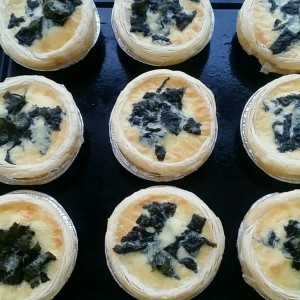 拿出蛋挞皮先倒入少量奶油糊,放入一片火腿,在继续倒奶油糊至9分满,撒上紫菜