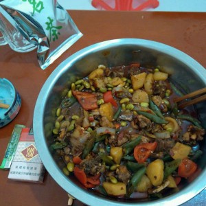 加入去皮土豆和豆米米,然后就开始烧鸡了。