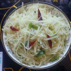 锅热下树椒 蒜 泡椒爆香,下土豆丝炒,出锅前加白醋,葱花,味精