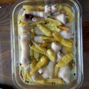 鸡爪煮好后,用漏勺撩出,冷水冲洗数遍。在保鲜盒中放入花椒、八角、姜蒜、桂皮(香料是重新准备的),倒入鸡爪,放白醋、盐,适量的糖,带入一袋泡椒。加凉开水或矿泉水搅拌。盖上盖子放冰箱冷藏3小时。