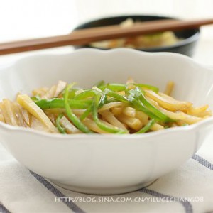 尖椒洗净切丝,蒜瓣切片,土豆切丝浸入凉水备用