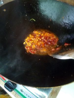 油热放入郫县豆瓣酱,姜,蒜,炒香。