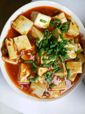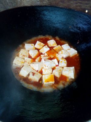 倒入豆腐。加点水。煮。因为豆腐易烂,所以不要用锅铲去翻炒,顺着划就好了。煮2-3分钟,放鸡精。倒入红薯粉兑的水,勾欠。起锅
