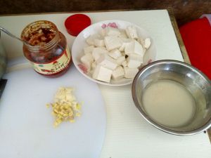 准备材料。豆腐切块,姜蒜切颗粒。红薯粉兑水搅匀。