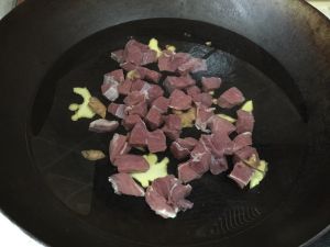 锅里加水,放入姜片、葱段和切丁的牛肉焯水沥干备用。