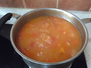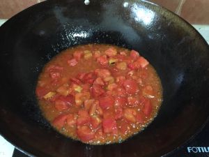 锅里放油烧热倒入西红柿炒软,然后加适量的番茄酱稍作翻炒后加入清水。