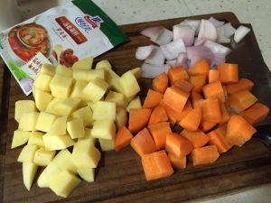 土豆、胡萝卜切丁,洋葱切片,西芹切段。