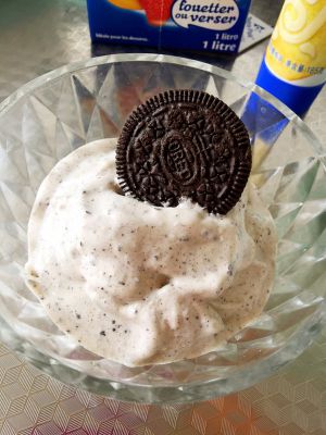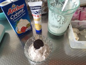 把香蕉依次加入搅拌机打碎,放入奶油,炼乳,奥利奥