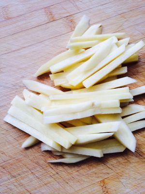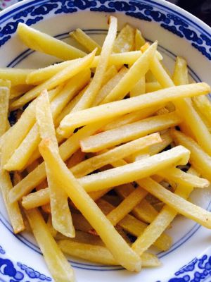 冷冻好后倒入已热好的油中小火炸至金黄…沥油后装盘将盐撒上即可…