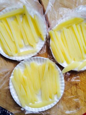 将切好的土豆放入锅中沸水煮3分钟…捞出尽量沥水沥干…包好保鲜膜放入冰箱中冷冻