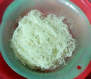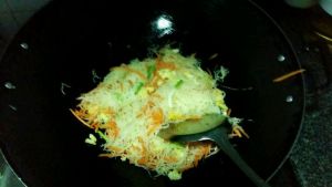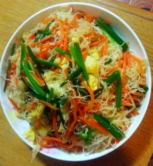 红萝卜翻炒后下盐,下米粉,然后下葱,再把鸡蛋放下去一起翻炒两分钟