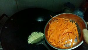 再起锅下油,下蒜蓉,再下红萝卜,翻炒下盐
