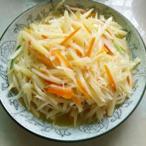 土豆切丝。切好后要用清水泡一会直到要煮时在打捞起来。