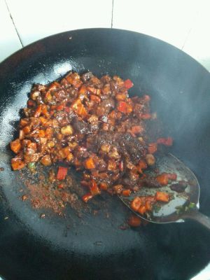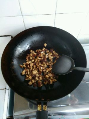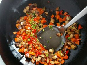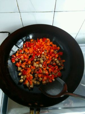 香菇香味出来后加入胡萝卜丁和甜椒丁,翻炒一会儿,至胡萝卜有些软了。