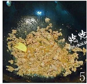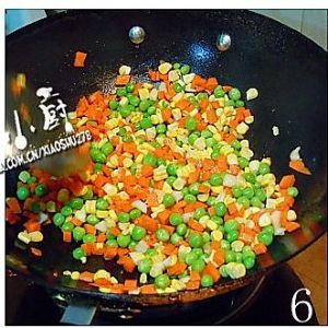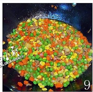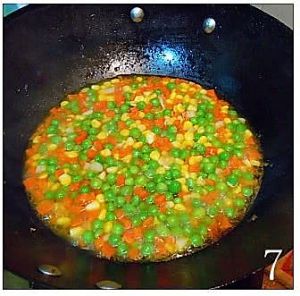 将炒好的肉丁盛出,锅内加1小匙植物油,把青豆、马蹄、胡萝卜和玉米粒一起倒进炒锅内翻炒1分钟。