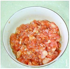 将肉洗净切成小丁碎,加入盐、生抽、生粉腌制一会。