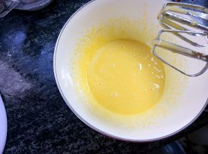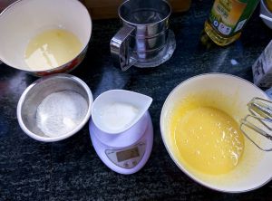 蛋黄中加入20克糖粉搅拌均匀后依次加入玉米油和牛奶,搅拌均匀。