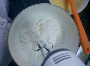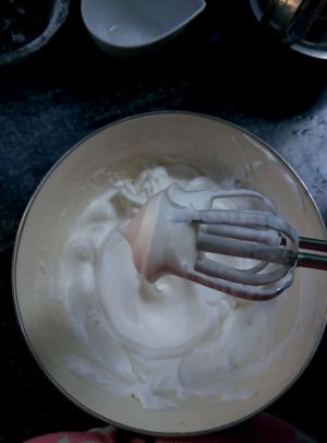 蛋白分三次加入30克糖粉,打发至打蛋器提起尖角处有小弯沟即可。