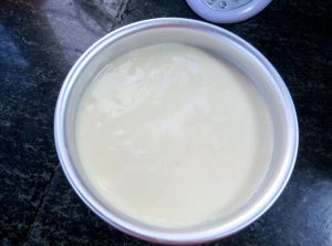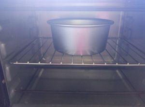 翻拌好的蛋糕液倒入6寸的蛋糕模中,震掉大气泡,放入烤箱140°上下火烤35分钟。