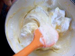 先加入三分之一的蛋白到蛋黄液中,翻拌均匀。再加入剩下的蛋白,上下翻拌均匀。(不宜翻拌过久,易导致蛋白消泡哦。)这个时候就可以预热烤箱了,180°预热。