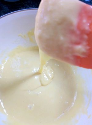 低筋面粉过筛加入蛋黄液中,搅拌至无颗粒,提起连绵不断落下即可。