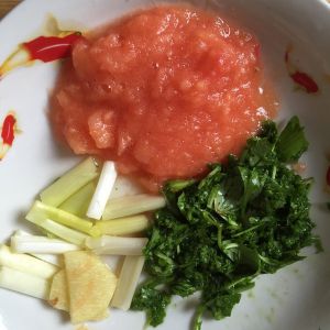 西红柿热水烫过放入搅拌机打碎,荠菜洗净打碎。葱切段。PS:姜是用来做成人饭菜用的,小宝宝并不适合吃。