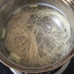 水煮开放入葱和面条一起煮。