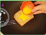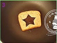 锅里加少量橄榄油(其它油也可以),放入刻好镂空的土司片;