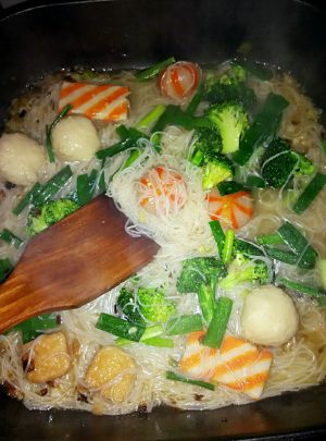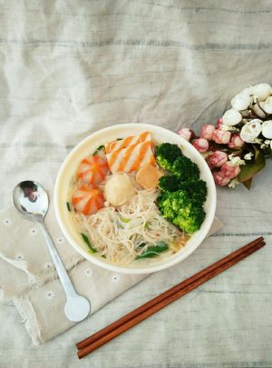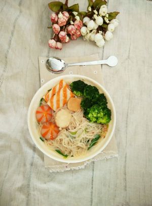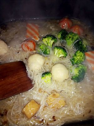 米粉差不多7分熟就可以放入西兰花搅动一下加盖一分钟西兰花和米粉就差不多都熟了