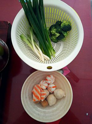 先把需要的材料准备下,洗干净备用(西兰花刻朵、葱白切丁、葱叶切段)