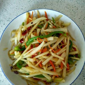 热油,放入干辣椒,花椒,青椒丝,胡萝卜丝翻炒