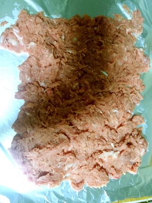 把肉泥平铺在铝箔纸上,可用勺子压平。