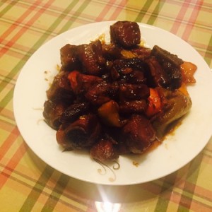 炒过排骨的油我没有留而是倒掉了,因为觉得那油一直高温,不太有利于健康。新放非常少的油,翻炒了葱丝姜丝和拍好的蒜。再加入醋生抽和料酒翻炒大概1分钟后加入开水莫过排骨,然后加入糖和橙子皮。中小火煮30分钟后收汁
