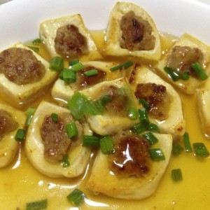 煎至豆腐两面焦黄上碟,原煎锅倒鲍鱼汁热一下,淋到酿豆腐上,撒上葱花,完成。