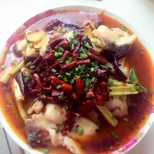 把炒香的干辣椒,干花椒和油一起倒在鱼肉上,再撒上点葱花,一份香喷喷的麻辣水煮鱼就做好了