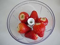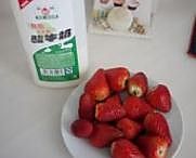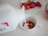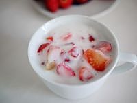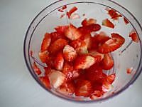 到一层酸奶没过草莓后再把其他的草莓丁放入杯中,再倒入酸奶没过草莓