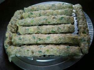 4,腐膜攤開,放适量肉餡上去,弄成條狀,圈起,用刀劃斷,摆好。