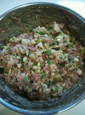 3,把以上材料加生粉,鹽,生抽,面粉,鸡蛋,五香粉拌勻,面粉看情況而放,拌好比餃子餡略湿點。